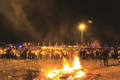 入夜,草原上熊熊燃烧的篝火照亮夜空,和四周的火把一起,照亮了彝族同胞喜庆的面庞。