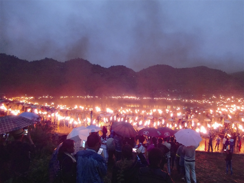 从此,彝族人为了纪念这一天,每年的农历六月二十四这天便要以传统方式击打燧石点燃圣火,燃起火把,走向田野,以祈求风调雨顺、来年丰收。人们载歌载舞,普天同庆抗灾的胜利,歌唱阿体拉巴的英勇和妮璋阿芝的聪明美丽。久而久之,便形成了彝家一年一度的火把节。