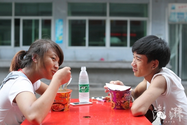 8月21日,深圳,阿海和阿美在一块吃泡面。