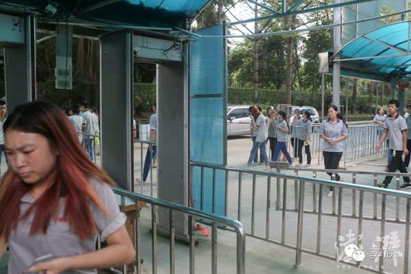 8月20日,阿海打工的工厂门口。该工厂实行封闭式管理,工作时必须穿工衣,进出工厂需要通过安检门,上下班有严格的打卡规定。