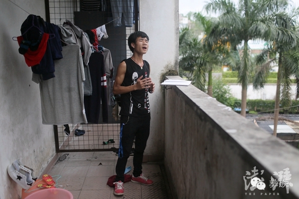 8月18日,东莞,在阳台上唱歌的阿海,他面前摆着专门用来抄写歌词的本子。他会把对女友和亲人的思念编进歌曲里。