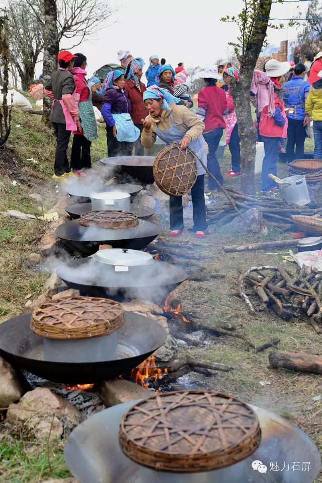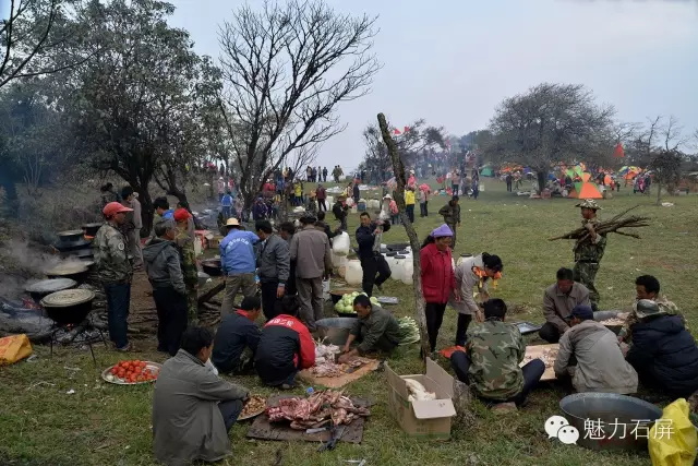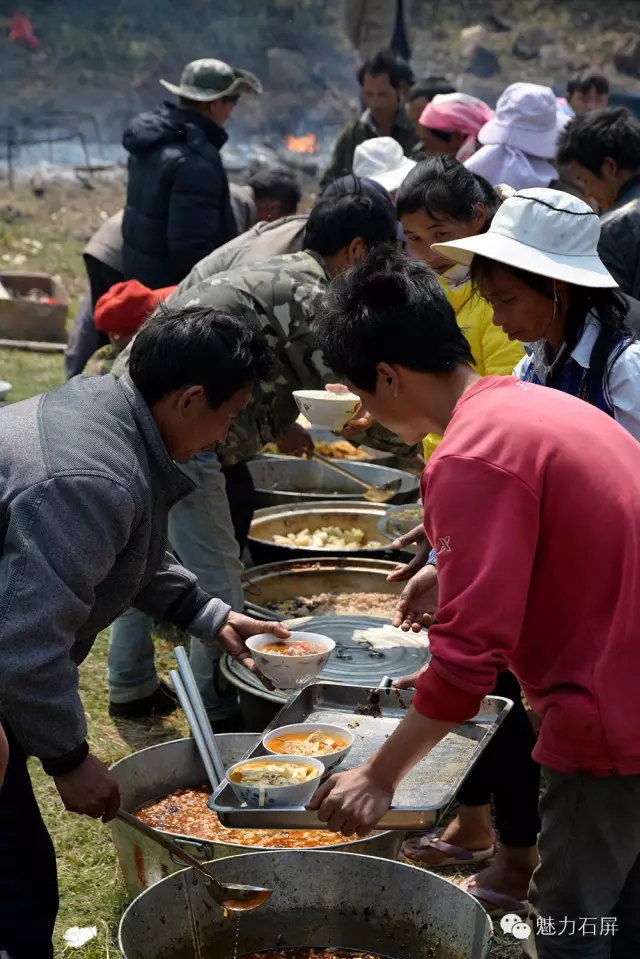 中午时分,所有来客席地围坐,开始就餐,享受美食。村里组织者按规矩,派发给一百多户村民每户准备两桌碗筷的任务,并带上山,供自家和来客使用。但由于无法、也不可能精确估计来客数量,准备的餐具碗筷往往不能满足大家同时进餐。东道主村的村民们,准备完餐食,安置好来客后,便在一旁等候,等到客人用餐完毕后,才收拾洗净餐具,轮流用餐。