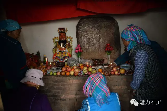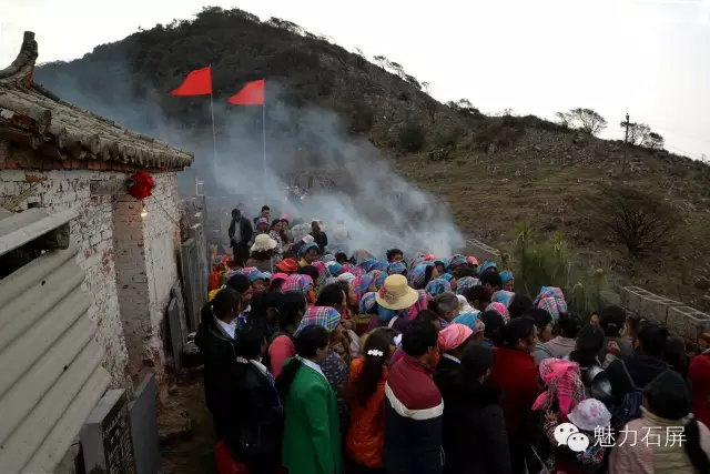 二月初九的清早,晨曦微露,村民们开始结伴上山。以前交通不便,只能步行或者马驮。现在交通改善了,修通了土公路,车可以行至离赶庙会地点很近的地方。下车爬山大约200米,便可看见那座石质建造的简陋小庙,村民称作“九龙庙”,供奉“九龙王”。