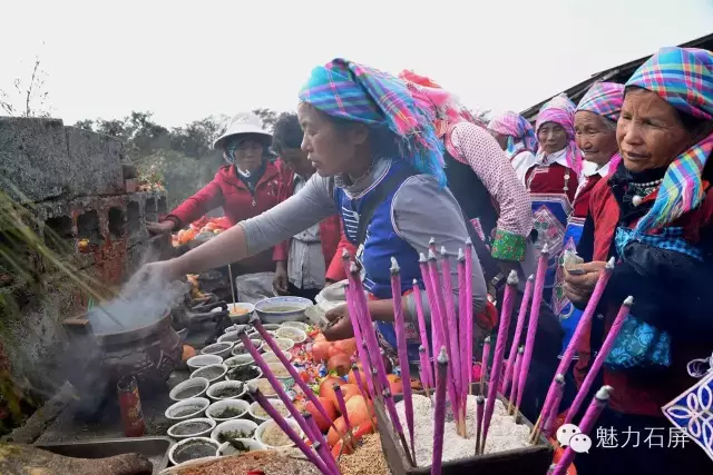 大冷山海拔2551米,是石屏县境内最高峰。山顶常年雾气缭绕,植被茂密,草场丰饶,是当地人心目中的神山。为了准备“赶庙会”活动,村里提前好几天就忙开了。专事通神许愿的巫婆,操办美食的厨师,参与表演的各村歌舞队,他们都早早做着准备,并于庙会前一天提前上山,住在帐篷里,期待着这个重要时刻的来临。