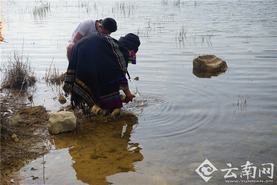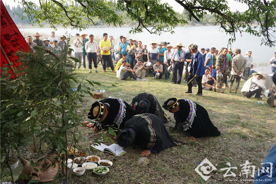 祭龙仪式在长湖岸边的一棵古老的“龙树”下开始,在毕摩的带领下,村里的主事的男子磕头祈求龙王,保佑一年风调雨顺,五谷丰登。祭拜完后,作为祭龙仪式的最后一个环节,毕摩将准备后倒入湖中放生,为全村人积福积善。