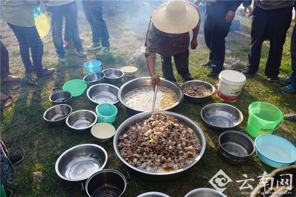 早上宰好的猪羊煮起来,祭祀完后将分给村民享用