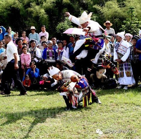 届时,人们穿着特定的服装,姑娘穿白色短衣,青布裤,打着绑腿,佩戴项圈耳环,腰束彩带。小伙子穿四件崭新短衣,件件衣领外露,有九个小伙子手持长竿(象征祖先使用的长茅),外披蓝色长袍,聚在广场上。“师公”率众用猪头祭祀祖先,并登上竹台正式宣布开始跳金竹舞。“麻公巴” ——领舞者头戴白高帽,身着长袍,脚穿新鞋袜,带领众人,踩着芦笙、锣鼓点翩翩起舞。舞蹈持续两天,第三天中午,所有男女老少一同登上高山之巅,在“师公”主持下又祭祀祖先一次,然后纷纷离去。