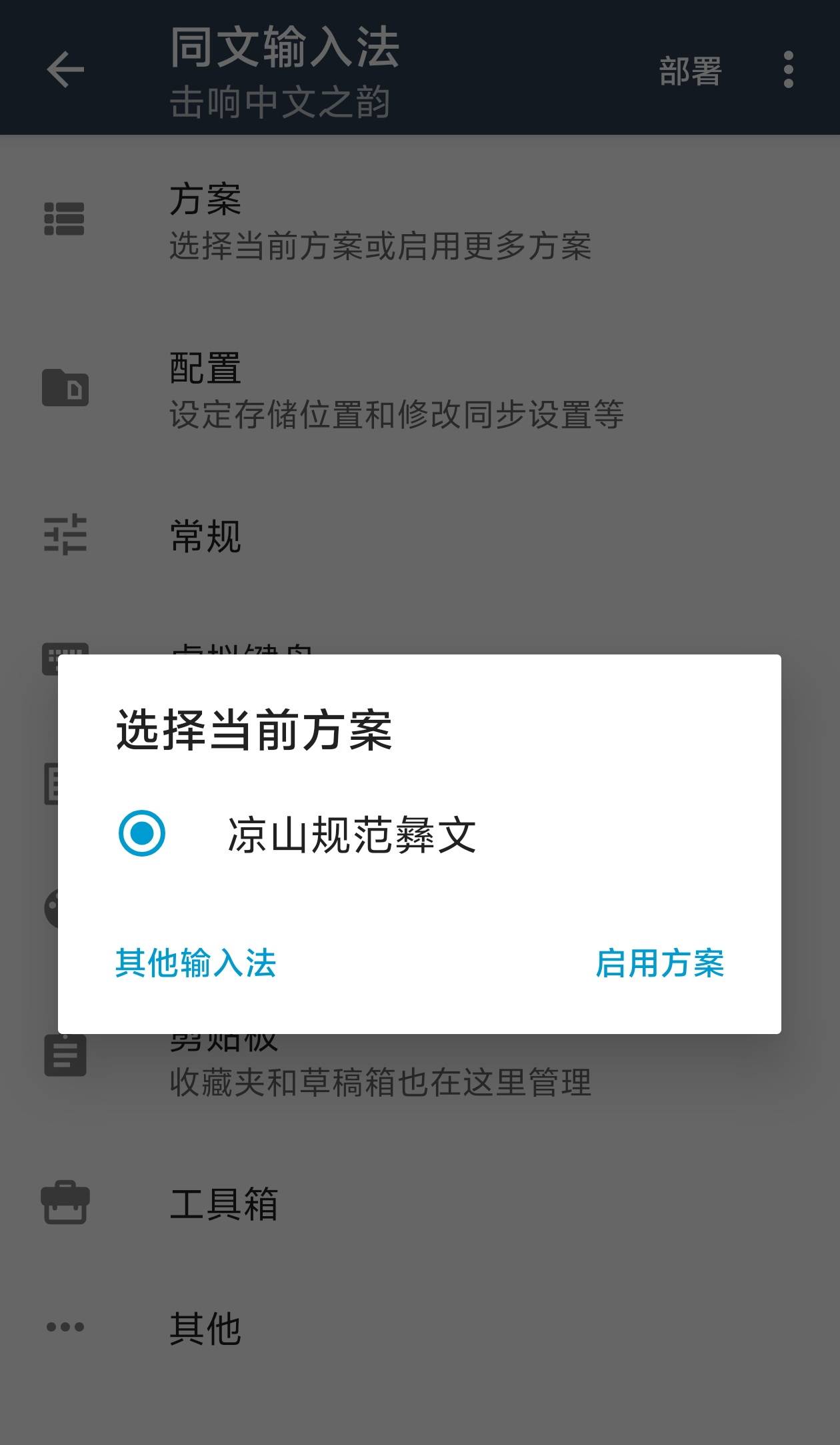 第三,点击同文输入法界面中的“方案”,可以发现同文输入法框架上已经装载了“凉山规范彝文”输入法。换言之,我们的凉山规范彝文输入法成功加载到了同文输入法框架,可以在安卓手机上使用了。
