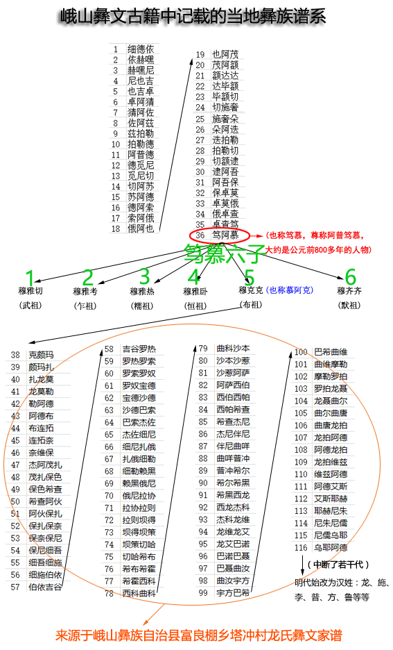 6、龙莫勒是五世(即布祖后裔第4代)(彝族六祖之布祖慕克克谱系)。