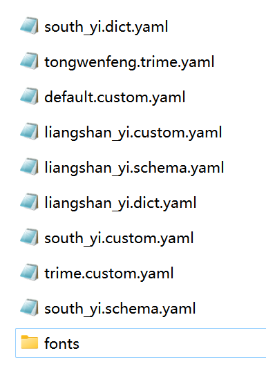 下载后解压,你会发现解压出了10个文件:9个yaml格式的配置文档+1个名为“fonts”的文件夹。如下图所示: