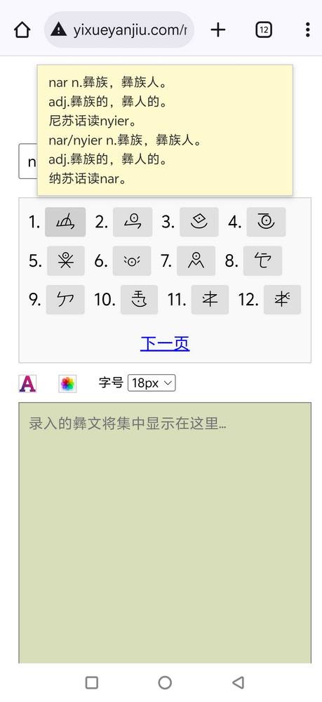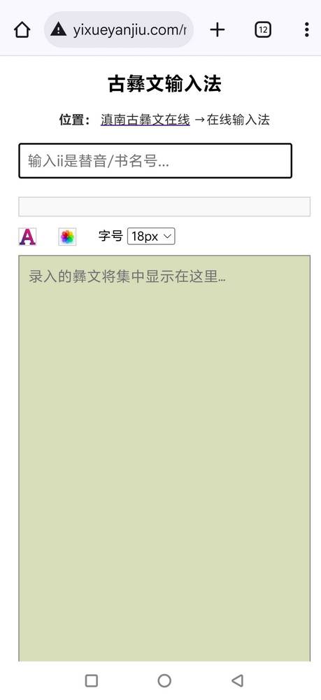 然后,打开你的安卓手机浏览器,输入这个滇南古彝文在线输入这个网页地址http://www.yixueyanjiu.com/nisufont/yiInput.jsp,输入后如图所示: