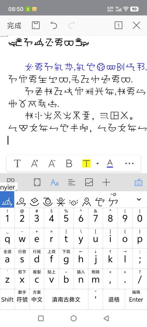 好了,你可以在安卓手机的文本编辑软件WPS和视频编辑软件剪映、威力导演中输入彝文进行测试。你也可以在浏览器网页中的在线输入那里的文字输入框中进行测试。下图是笔者用同文输入平台定制的滇南古彝文输入法在手机WPS中使用的示例: