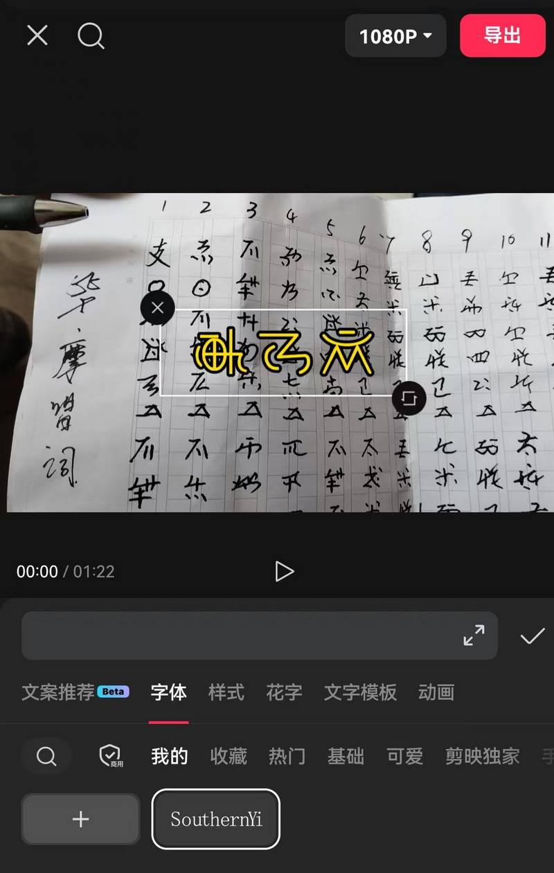 然后,在剪映里面编辑一段短视频,把几个彝文字复制进去作为视频标题文字,然后设置文字样式,点击我的字体导入刚刚复制到Fonts文件夹下的彝文字体SouthernYi.ttf即可。如图所示: