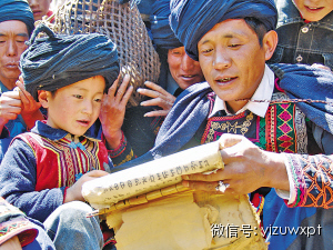 父传子承是彝族毕摩文化传承中最为重要的制度,图为曲比类类在授徒。
