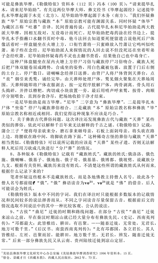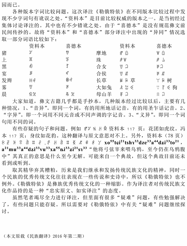 译注彝文古籍牵涉方方面面,很多彝文古籍内容融历史、宗教、天文、文学、民俗等各种学科内容于一身,所以字里行间往往潜藏着千古之谜,读懂它不容易,译注它更不容易。这次译注《勒俄特依》也只是在前贤译注的基础上做点译注工作而已。