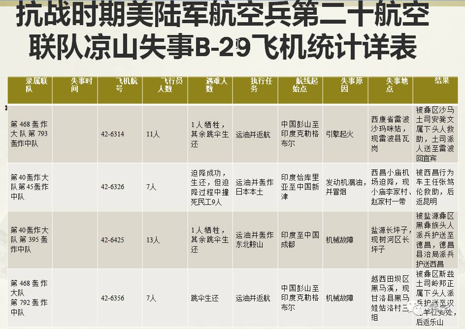 抗战时期美陆军航空兵第二十航空联队凉山失事B-29飞机统计详表(点击图放大)[2]