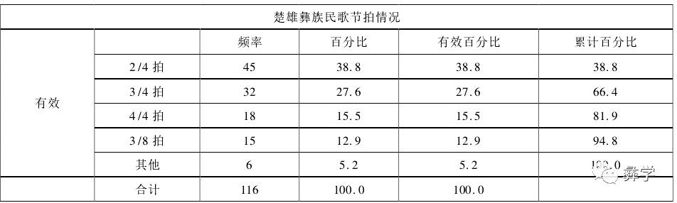 笔者从研究中发现楚雄彝族民歌的音乐节奏是比较规整的节拍,大部分由 2/4 拍构成,少部分为 3/4 拍与 3/8拍。笔者抽取的 116 首民歌中,节拍分布如下: