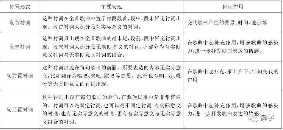 笔者在分析 116 首彝族民歌样本衬词时发现,衬词在彝族民歌中的位置可分为段首衬词、段末衬词、句前置衬词、句后置衬词四大类,具体变现形式与作用归纳如下: