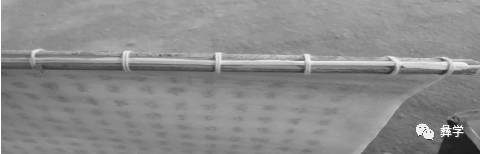 从装帧上来看,诺苏经籍原先可能有过卷子装、蝴蝶装、包背装、线装等多种形式,如今所见的经籍,一般是将一页较大的纸对折成两页,再将按此折成的书页堆叠成册后,按照蝴蝶装的方式或包背装的方式装订,但都不是按照汉文古籍中这两种装帧方式本来的方法来粘边或装捻子,而是取一根长短、粗细都合适的竹棍剖成两瓣,长度超出书的两端各一寸许,用这两瓣竹片夹住该装捻子或该粘连的一边(卷轴装的痕迹),再用线装订(线装的痕迹) (见图7)。这里将其暂称作“线订卷轴蝴蝶装”和“线订卷轴包背装”。还有一些经籍则并不采用一页一页对折的方式,而是按照料纸的实际大小,采用适当的折叠方式进行多层折叠,在最后一层折口一边上轴后用线装订,再把其余各边都裁开成单页,书写时大部分按照包背装的形式书写,少部分则按照蝴蝶装的形式书写,也有个别按照册页装的形式书写的。其上轴的方法有两种: 一种是只用一根竹棍或竹片,将其夹入最后一层折口内作轴,再用线订。这种装法的轴上一般没有穿线的眼,也就没有了多点固定,松了以后就可以将轴从两端抽出或插入,并不稳定(见图8) 。另一种方法则将一根竹棍从一头剖为两瓣,但另一头不剖开,而是留下一个竹节。上轴时将一瓣插入纸张的折口里,另一瓣夹于折口外,让两瓣竹片将书页夹住后再用线订,最后把竹片开口的一端用线拴住。个别经籍还在竹片上钻口穿线固定。这种方法比前一种方法更为稳固,采用者较多。线订没有固定模式,订口无定数,上线方法也不固定,比较随意,以订稳为原则。有个别经籍因为开本很大,又厚又重,需要用较厚较粗的竹片作轴,甚至需要用铜丝装订。