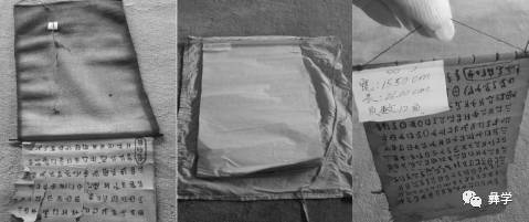 从护封上来看,诺苏宗教经籍一般都会在前后各留一页纸作封面和封底。除封底外,书后还经常多留一页或数页白纸,表示经籍的内容有所脱漏,没能将其完整地写完,客观上则对有字的书页有着很好的保护作用。经籍装订好后,以竹片为轴心,按封面在内的方向将书卷成一轴,外以棉布、麻布、羊皮、兽皮等包裹( “褾”的痕迹) ,在裹皮的一角拴一根绳子( “带”的痕迹) 用以缠缚,再在裹皮上有带的一侧写上书名,以便查找。个别经籍则直接用麻布、棉布等作封面或封底,同样也订上一绳用以缠缚。由于布的封面或封底都会大于书页,卷轴后自然就成了书衣,形成所谓“布面裹卷装”[2](P.121)“封底(封面) 裹卷装”[3](P.65)( 见图 9) 。这种包裹方法在其他地区的彝文经籍中比较常见,但在诺苏宗教经籍中很少。有的经籍如《间隔经》、《防癞经》等则因为需要将其挂在屋内的柱子上或墙上,所以还要在轴的两端系上一根长短合适的绳子(见图9),以便挂在挂钩上。