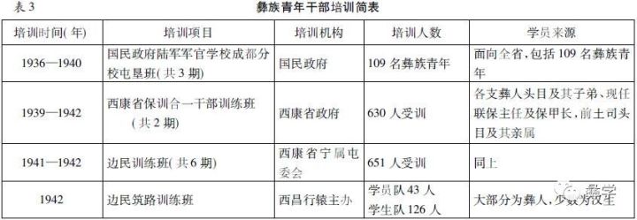 2.彝族青年培训。1936年国民政府陆军军官学校在成都分校开设屯垦班,招收彝族青年。凉山送去10名学员,1938年再送去7名,1940年招收92名彝族青年到成都受训。1939年,西康省在汉源举办两期“西康省保训合一干部训练班”,有630人受训。同年西康省宁属屯委会开设边民训练所,1941-1942