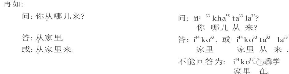 33di33“原由”,有些不是一个词而是两个虚词的连用,如: ʑi31ko33“(语)+(助)”,o44ko33“(语)+(助)”,ko33ɯ33“(助)+(助)”,ko33li33“(助)+(助)”mu33ta33“(助词)+(助词)”,thi44ʑi31“这样”+语气词。例如: