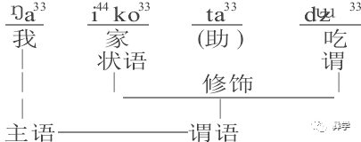 (2)从语法功能上看,彝语的体状助词与汉语的介词不同。汉语语法介词的定义一般都是“用来介绍名词、代词或名词性词组给句中的动词,以表示处所、时间、工、原因等意义关系的。”汉语的介词是在句法结构中起引合作用的词,介词的宾语一般不能作为一个成分跟后面的动词直接发生关系,而是要先与介词组成介宾结构后再修饰谓语动词。而彝语的体状助词是连接修饰语与被修饰语两个句子成分,没有引介的作用。所以,彝语的体状助词和汉语介词在句法结构的层次关系方面是不同的。例如“我在家里吃饭”一句: