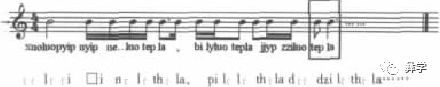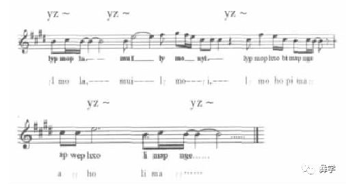 音乐分析:吟唱式音调,旋律线条单一。句首吆喝音上扬,句尾下滑音结束。核心音调为彝族颤音吆喝+同音反复。大量的出“短长”类型,有同音高短长、高低音短长和低高音短长三种类型。“短长”中的短音与语音中的紧喉音对应,长音与语音中的松喉音对应。