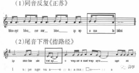 “短长”是在彝族毕摩仪式音乐中频繁出现的节奏表现形式,即后附点音符形式的“短长”节奏,往往与彝族语言中的紧喉音、松喉音、清音和浊音对应。