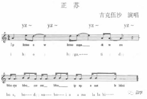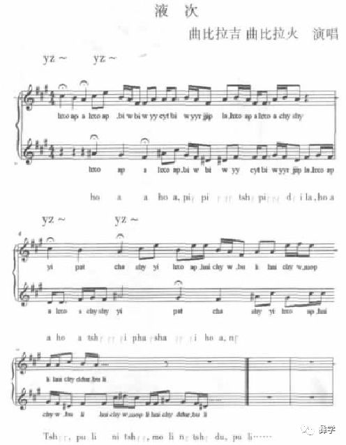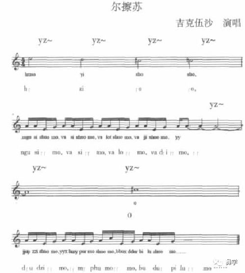 记音说明:从“语言音色说”的角度,绝对排斥译文歌词(歌词大意以注释的方式出现),因为使用译文歌词必然丢失地域性语言音色,也就是丢失各地域(各民族)音乐元素的显性符号。所以乐谱下第一行是彝语拼音,第二行是国际音标,另有歌词译意。