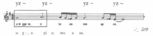 笔者在彝族毕摩仪式音乐中感受到两个个性音乐特征,一个命名为“彝族颤音”,用“yz~”在谱例中标示。另一个命名为“短长”,是在经腔中大量使用的前短后长的后附点节奏表现形式。
