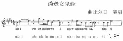 音乐分析:吟唱式经腔。引腔为腔少字多的表现方式,彝族颤音镶嵌其中。主体部分系句首感叹音(词)后接语言式旋律的风格,具有浓厚的音乐叙事感。句尾的下滑旋律走向与彝族语音中的下滑调相似。
