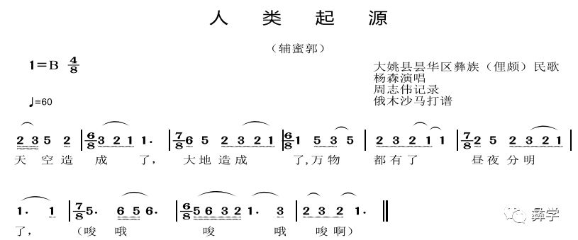 这首歌一共用了五个音,即do、re、mi、sol、la,显然是五音模式,这种调式在亚洲和东欧使用较多,群众基础广,比较稳定,歌曲有了五音的固定模式。这首歌选自《楚雄州民间歌曲集成》(图三),续词唱道:“人类还没造,地上无人烟。格资神王来,要造人类啦。天神来撒雪,大地都撒遍,撒下三把雪,变成三代人……,头把雪变成独脚人,人身三拃高,独自不会走,两人搂着才会走;泥巴当饭吃,沙子当菜吃,月亮照能活,太阳晒就死,这代人不行,要换第二代……”