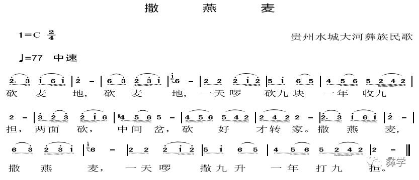 这三首贵州彝族劳作歌曲,歌唱了彝族人的三大主食即三大麦(荞麦、燕麦和小麦),荞麦、燕麦和小麦是云贵川高寒彝区的主要粮食,养活世代居住在这片土地上的彝族人民,凝聚着彝人深厚的记忆和情感,人们亲切的把它们称为“母亲麦”。在《撒荞歌》中,用生活化的衬词“搓搓”和“啊喽是喽喽啰”“吔吔”相互问答,非常有趣。在《撒燕麦》中是“一天砍(挖)九块,一年收九担”和“一天撒九升,一年打九担”,这是播撒燕麦场景的真实写照,燕麦蛋白含量高,营养丰富,但劳动强度大,产量相对较低,历史上燕麦是彝族人民长途旅行、迁徙和征战的主要干粮,对此彝族人有着深厚的情感。在《撒小麦》中,只用短短一句话就表达出了撒小麦的愉悦心情。劳作歌曲是人们调节生产生活节奏的绝佳润剂。在四川和云南还有《打荞歌》、《使牛号子》、《大麦熟透了》、《丰收调》等劳作歌曲。