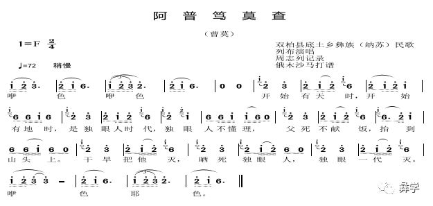 《阿普笃莫查》选自《楚雄州民间歌曲集成》,歌词里提到:“直眼睛一代兴,是直眼人时代。直眼人也不讲理。他们不祭祖,过年不上供,上不孝敬父母,下不养儿女,父母死去后丢放山头上。独眼不知理,直眼不讲理,这两代人都被淘汰了。天神来换人,洪水来淹天,阿普笃莫祖,躲进葫芦里,横眼睛一代兴……”