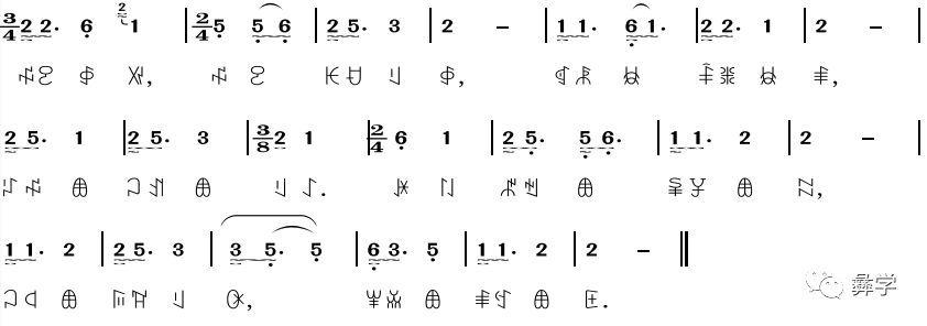 在歌曲《蒲莫里日》里xx.x的节奏反复运用(图4),使歌曲既符合彝语节奏的同时,也更加的平稳庄重。歌曲的旋法基本上以吟诵的形式,在八度内行进,主要用音为sol、la、do、re、mi,基本上以sol为核心,小三度(mi上行到sol)、纯四度(re到sol)的运用较多、特色小六度从mi下行到sol的音程行进在毕摩腔里经常出现,使歌曲彰显神圣庄严,叙述支格阿鲁的母亲及支格阿鲁的诞生过程。史诗和音乐密切结合,频繁运用于祭祖送灵、家族聚会、婚丧嫁娶等社会空间,也成为衡量彝族知识分子知识储备结构的重要标准。