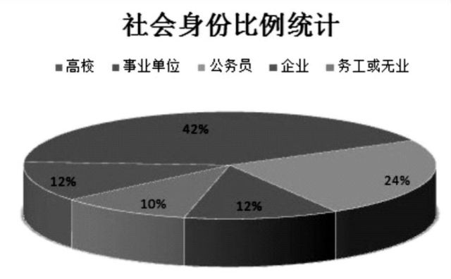2012 年,笔者与彝族文学编选者阿索拉毅合作统计了 58 位较为活跃的彝族诗人的社会身份,其中在高校和科研机构的有 7 人,在事业单位的有 24 人,公务员有 14 人,企业有 7 人,农村进城务工者 ( 包括无业者) 有 6 人( 如图示) 。