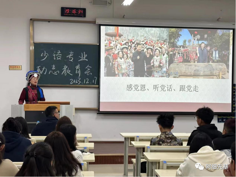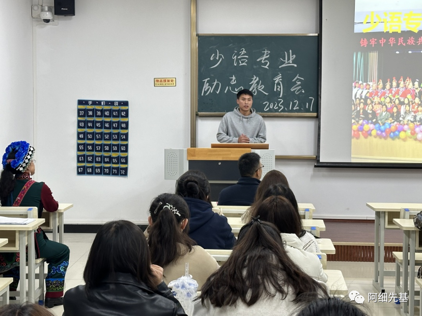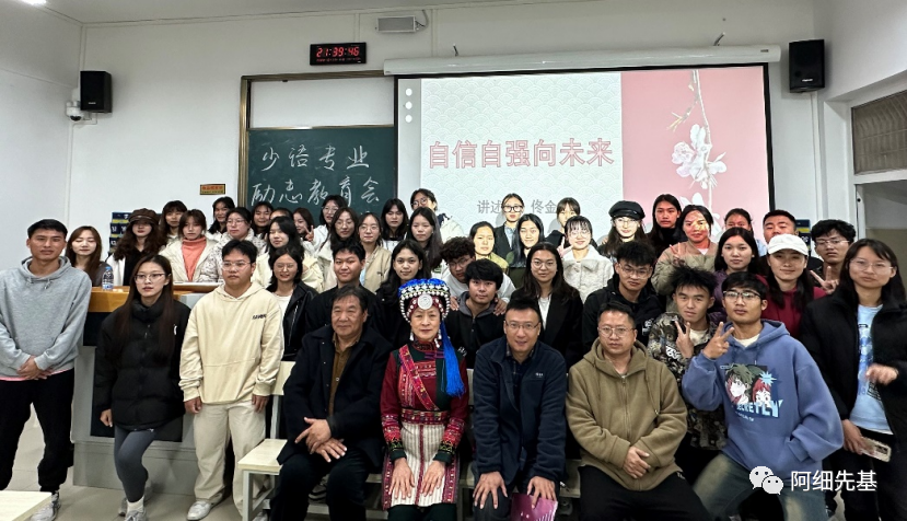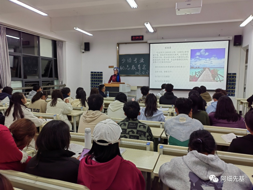 2023年12月17日晚七点到九点,红河学院人文学院中国少数民族语言文学专业(简称少语专业)在校博文楼A313教室开展了励志主题教育活动,特邀佟金兰老师前来对本专业学生开展大学生成长励志教育活动。佟金兰老师作题为“自信自强向未来”的人生故事分享。本次活动由少语专业李应昇同学主持,专业负责人李金发老师和专业教师高文老师出席,共有60余名同学到场聆听。